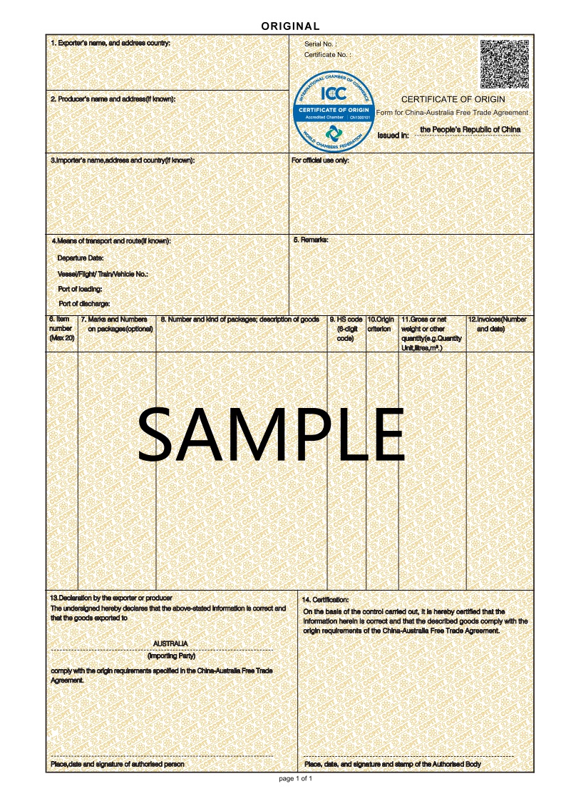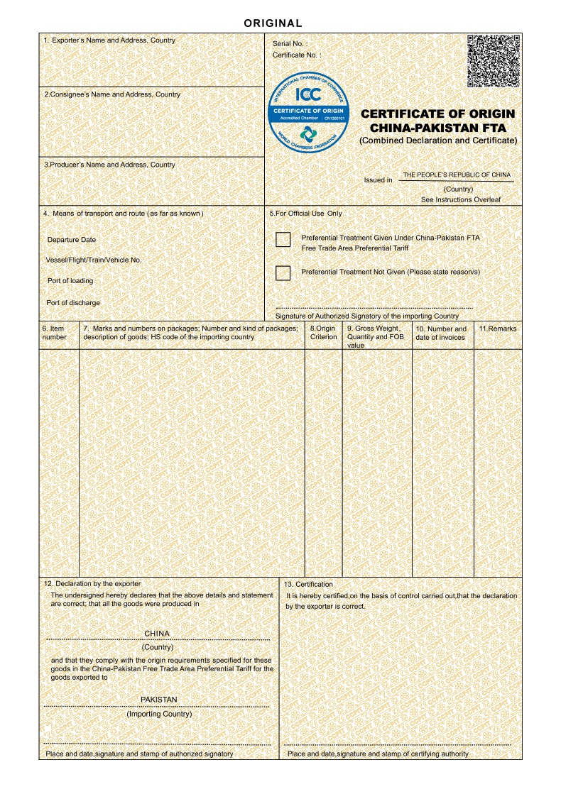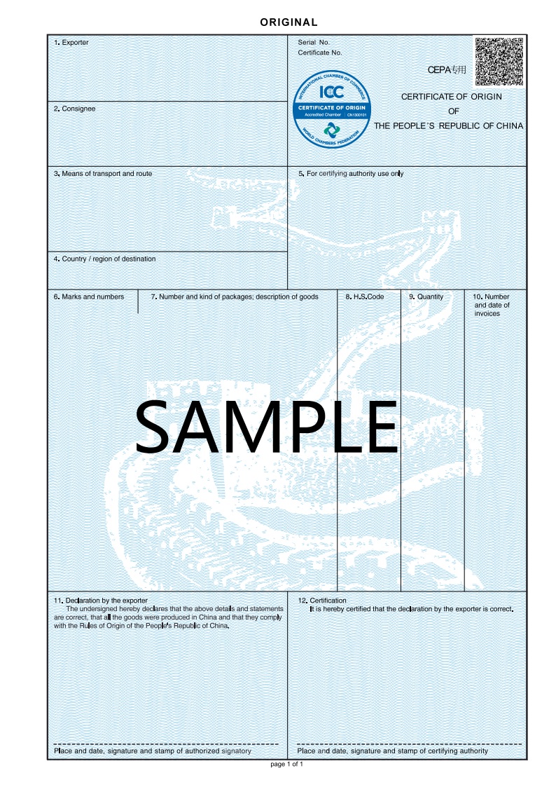 “原产地证书(CERTIFICATE OF ORIGIN),是出口国的特定机构出具的证明其出口货物为该国家(或地区)原产的一种证明文件。原产地证书是贸易关系人交接货物、结算货款、索赔理赔、进口国通关验收、征收关税的有效凭证,它还是出口国享受配额待遇、进口国对不同出口国实行不同贸易政策的凭证。