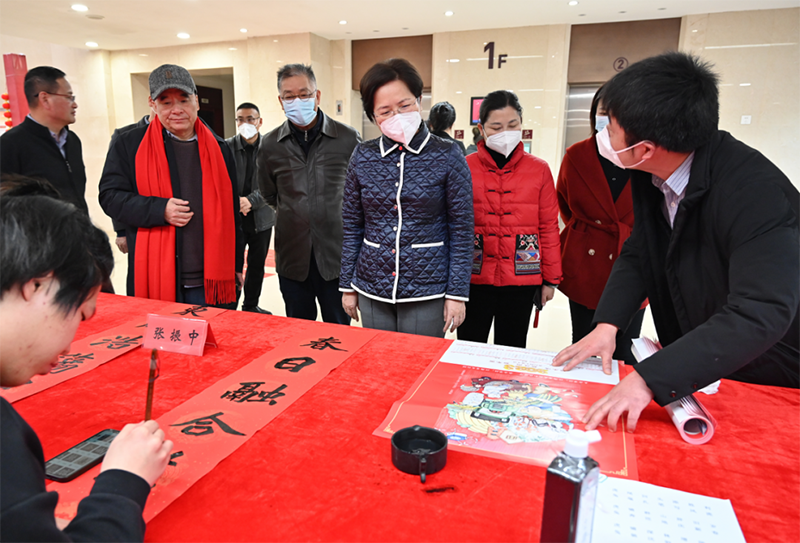 省文化和旅游厅党组书记、厅长梅亦慰问参加“笔墨凝书香 新春送万福”2023年送春联送年画服务活动的文化志愿者。