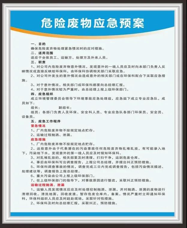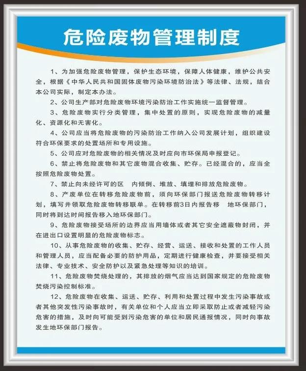 危废处置九大管理制度:名录制度、标识制度、管理计划和申报登记制度、应急预案制度、许可证制度、转移联单制度、事故报告制度、经营情况记录与报告制度、许可证颁发情况上报制度。