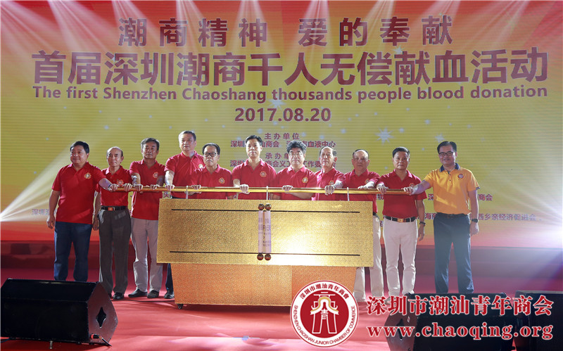 2017年8月20日,由深圳市潮汕商会、深圳市血液中心联合主办,深圳市潮汕商会义工委承办,深圳17家潮属社团协办的“潮商精神 爱的奉献——首届深圳潮商千人无偿献血活动”在会展中心成功举行。图为:领导推杆,正式启动首届深圳潮商千人无偿献血活动。