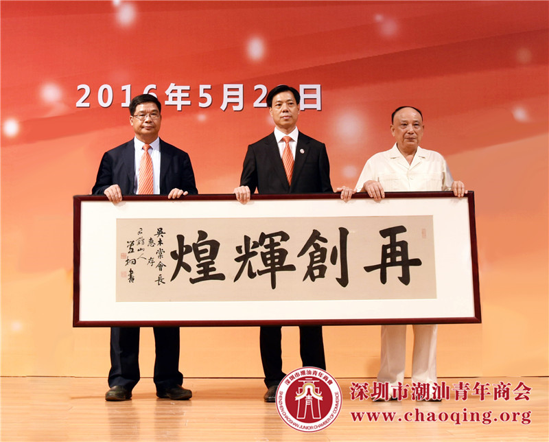2016年5月22日下午,深圳市潮汕商会第四届第一次会员大会隆重举行。图为深圳市潮汕商会创会会长吴开松(右)、第三届理事会会长黄榕城(左)、第四届理事会会长吴木棠(中)合影。