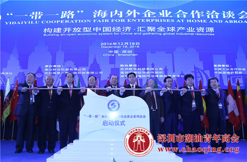 2016年12月18日上午,“一带一路”海内外企业合作洽谈会深圳分论坛在深圳五洲宾馆隆重举行。图为全国政协原副主席白立忱宣布“合洽会”系列活动启动,吴木棠会长与会领导一起推动启动杆。