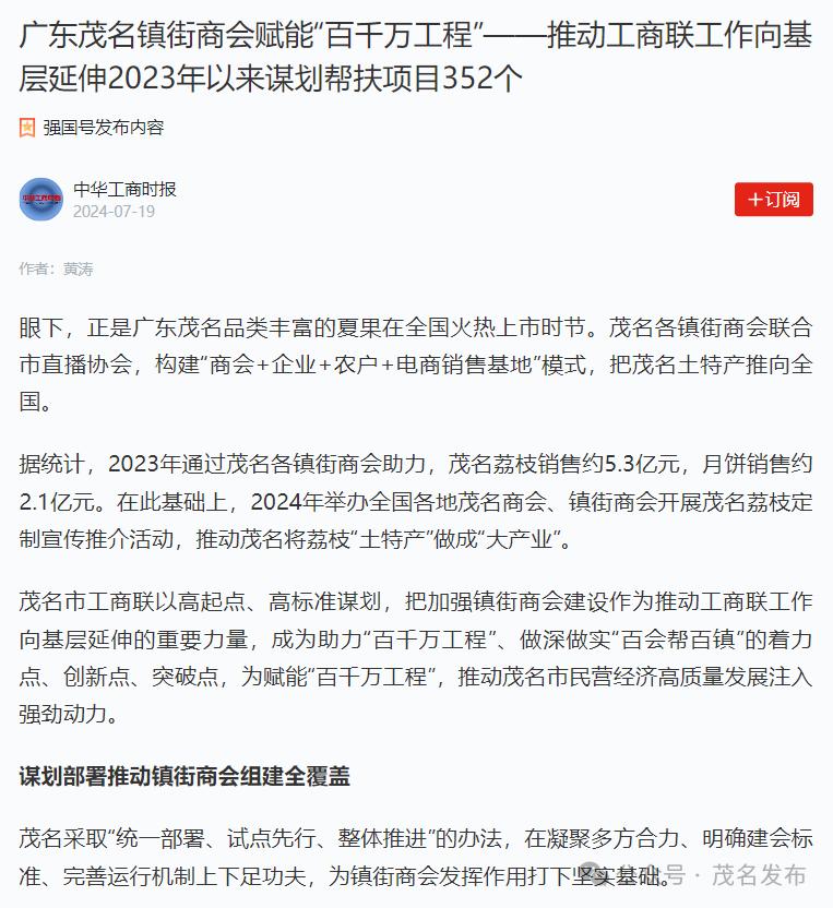 原标题:《中华工商时报报道|广东茂名镇街商会赋能“百千万工程”——推动工商联工作向基层延伸2023年以来谋划帮扶项目352个》