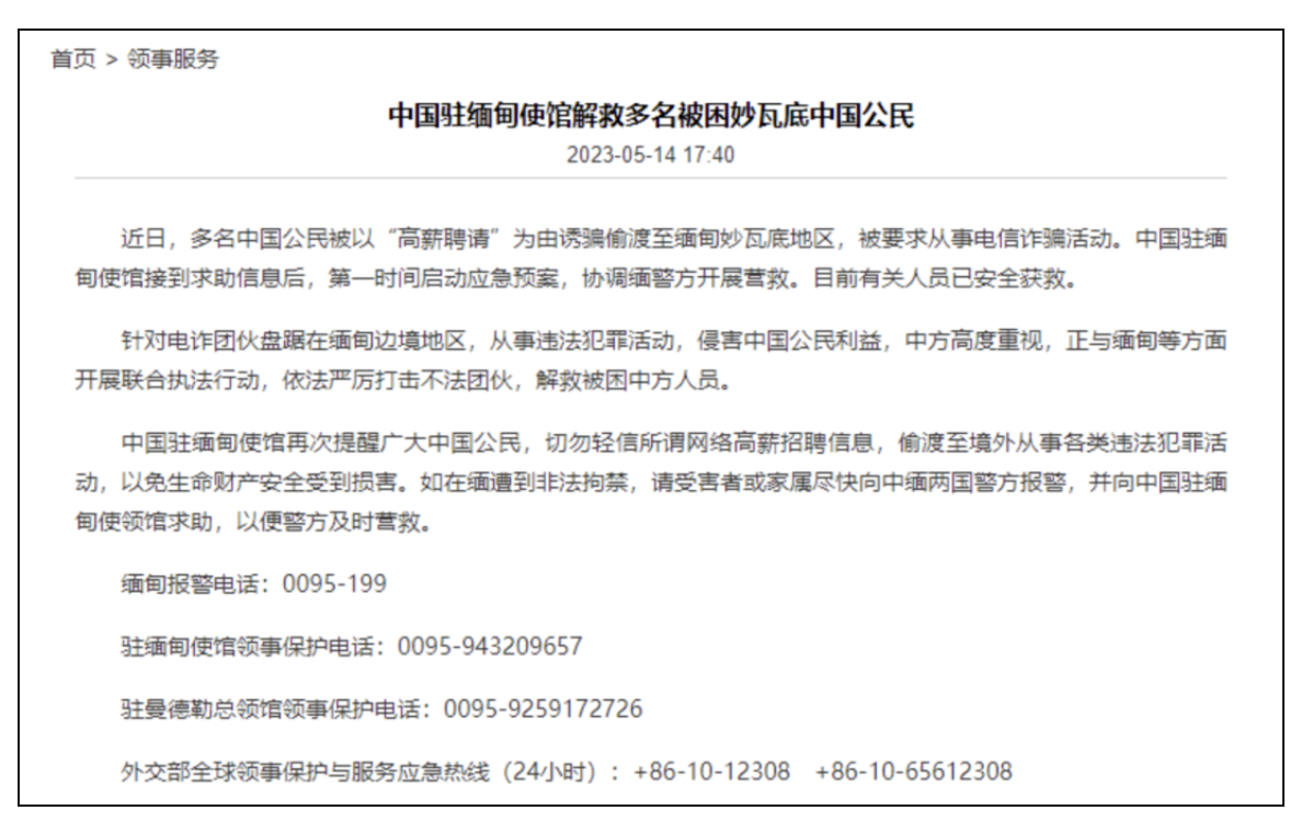 中国驻缅甸大使馆此前曾提醒广大中国公民,切勿轻信所谓网络高薪招聘信息,偷渡至境外从事各类违法犯罪活动,以免生命财产安全受到损害。如在缅遭到非法拘禁,请受害者或家属尽快向中缅两国警方报警,并向中国驻缅甸使领馆求助,以便警方及时营救。