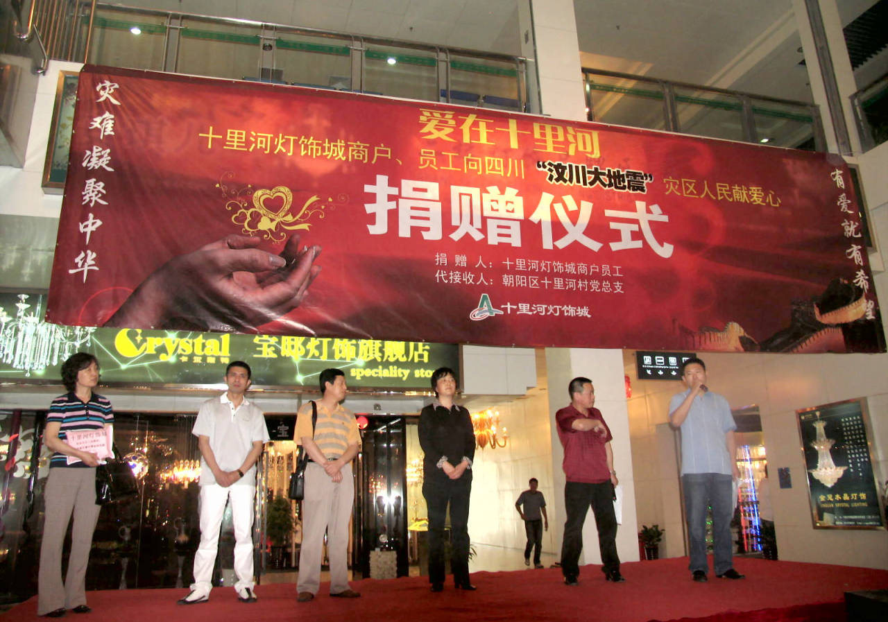 2008年北京奥运会期间,为了让北京特殊人群也能安全、平安地观看奥运会,十里河灯饰城对这些家庭的电路进行检查和整改,并为部分家庭送去灯具;汶川地震一周年时,十里河灯饰城向汶川地震灾区的困难家庭、中小学校捐赠上万盏节能环保灯具,以实际行动支持灾区重建工作。