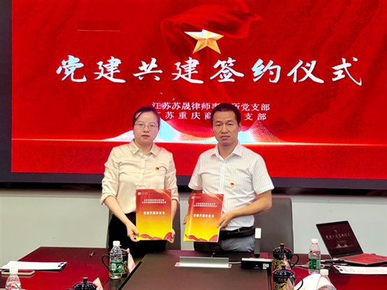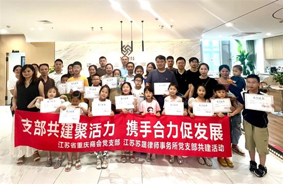 为更好加强基层党建工作,增强凝聚力量,促进商会工作发展,江苏省重庆商会党支部与副会长单位江苏苏晟律师事务所党支部于7月26日下午举办了结对共建座谈会,并联合开展支部共建“党建引领 与法‘童’行”主题活动。本次活动在苏晟律师事务所会议室举行。