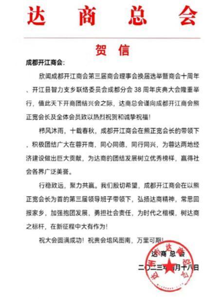 会上展示了来自开江政协、达州总会、成都达州商会、成都南充商会、北京达州企业家商协会、成都宣汉商会、成都达川商会、成都大竹商会、成都渠县商会、广东开江商会、重庆开江商会、驻蓉老协等发来的贺信!