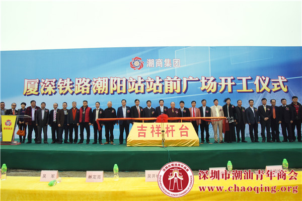 2014年12月28日,深圳市潮汕商会、潮商集团“双喜临门”——潮阳潮尚城奠基、厦深铁路潮阳站站前广场开工。图为出席仪式的重要领导嘉宾一起推动吉祥杆启动潮阳站站前广场项目。