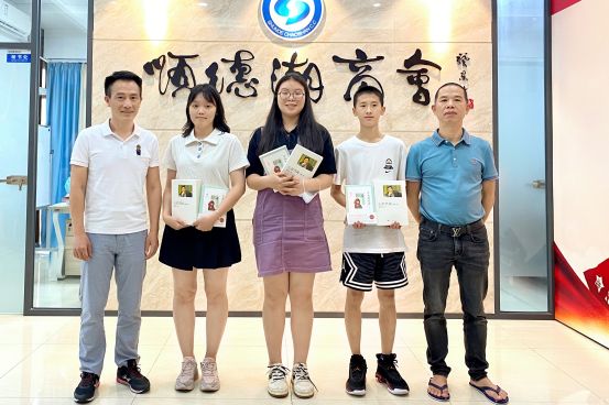 顾问一笑老师(左一)和副会长王继欢(右一)为优秀学子许启妍(左二)、陈佳淳(左三)、王萃峰(家弟代领)(右二)颁发纪念品
