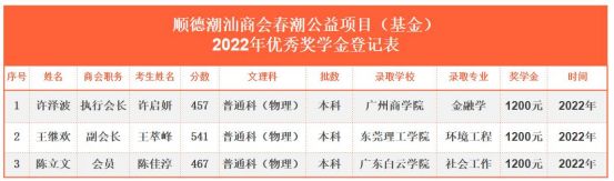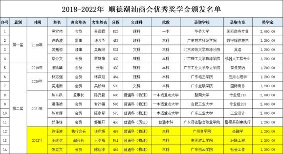 2018-2022年 顺德潮汕商会优秀奖学金颁发名单