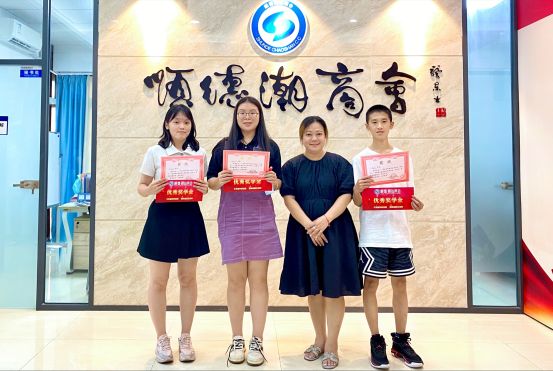 副主任姚晓芳(右二)为优秀学子许启妍(左一)、陈佳淳(左二)、王萃峰(家弟代领)(右一)颁发优秀奖状和奖学金