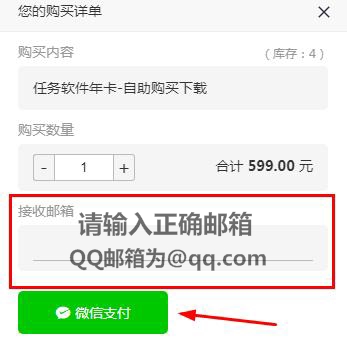购买方式1:直接咨询客服扫码支付(备注:邮箱,如QQ邮箱)付款后5分钟内会发送到您预留的邮箱,付款后忘记预留邮箱的直接截付款截图给客服,客服会直接发你软件下载地址和激活码),找客服扫码支付年卡只需要589元,永久卡只需要1389元,因为自助购买走的发卡平台收我们10元手续费,这个10元可以让利给用户!