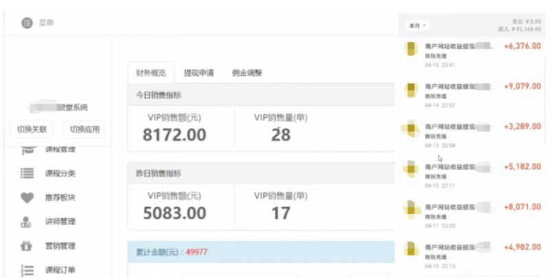 知识付费也是现在的主流项目,这是一个网赚老司机,盯上了我们的圈子教程,然后搭建了一个知识付费的平台,搬运软件中的课程来卖VIP,一个月下来差不多10来万,图中为后台4月份的收益。当然了,这个收入跟他丰富的经验是分不开的,如果你想达到他的水平,原创培训一定要好好学学!