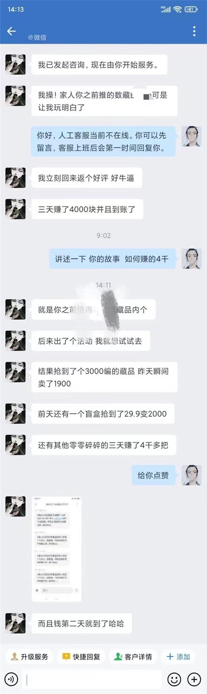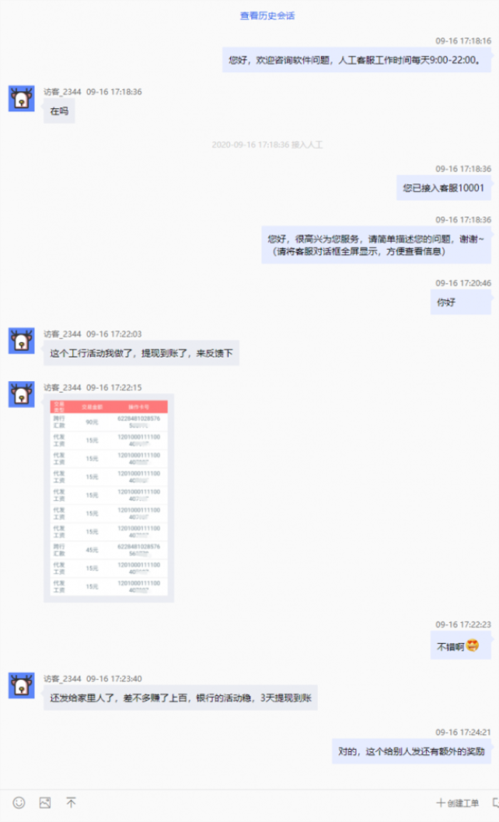 这是用户和在线客服对话,反馈一个现金任务。当天操作几分钟,3天后提现,奖励15元,因为这个是银行搞的,对于任务也没有加以管理,带家人朋友一起做,几百块钱妥妥的。