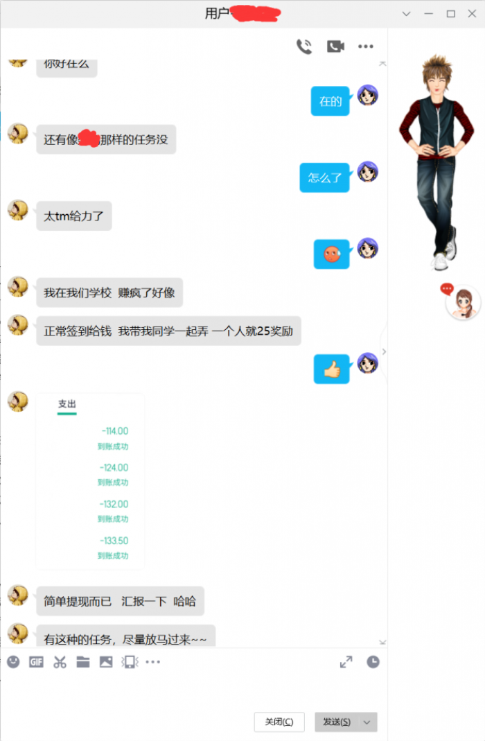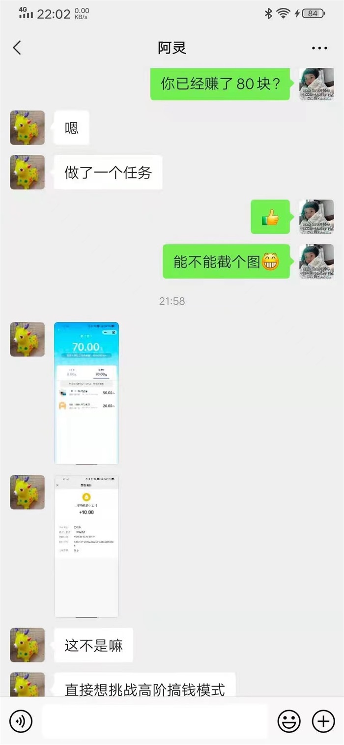 这是用户和在线客服对话,反馈刚加入一天做的一个任务。当天操作就挣到80块!而且这用户刚加入就认为软件非常给力,想直接玩转高阶长期项目!