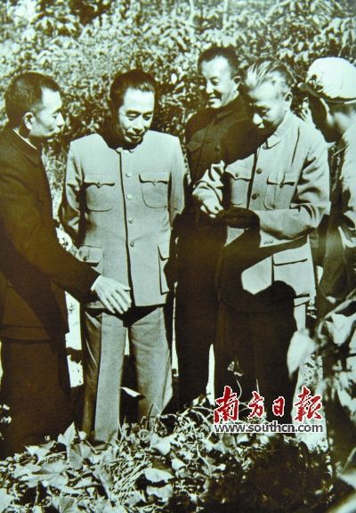 11月刘少奇(左四)、周恩来(左二)、罗瑞卿(左三)、陶铸(左一)在广东省视察胡椒园(见下图)。
