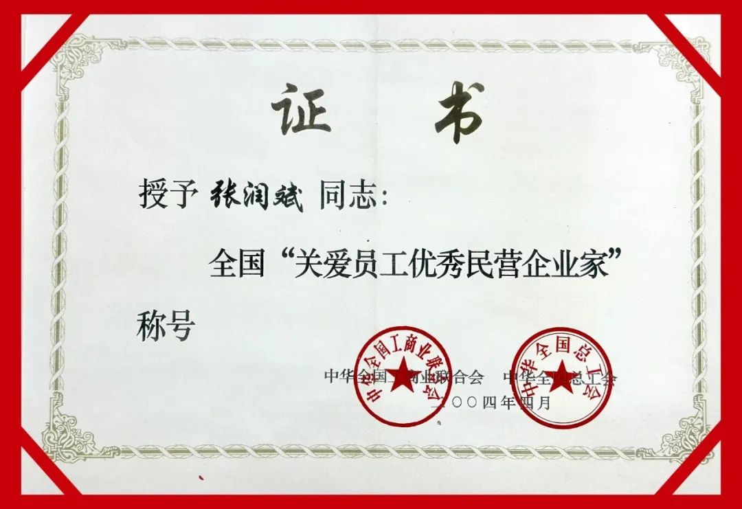 2004年,荣获中华全国工商业联合会、中华全国总商会颁发的全国“关爱员工优秀民营企业家”称号