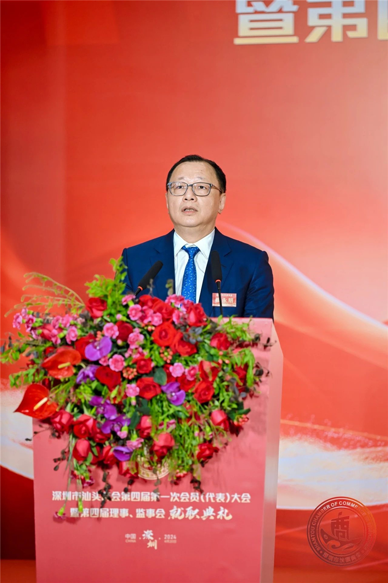 今日,我们站在汕头商会发展的新起点上。在全体会员的支持与信任下,我很荣幸地连任第四届理事会会长,这既是崇高荣誉,也同时承载着沉甸甸的责任。新时代赋予我们新的使命与担当,在未来的征程中,我们将与全体成员携手,继续弘扬商会的优良传统,不断创新发展理念,努力实现更高层次、更大规模的合作与发展,引领汕头商会迈向更加辉煌的未来。