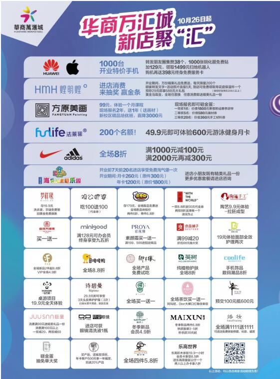 10月26日起华商万汇城开启“新店聚汇”活动,全场购物享折扣,买一送一、满额立减、积分送好礼、抽奖赢金条等优惠接踵而至,活动力度空前,很多知名品牌活动比线上双十一活动还要优惠很多,是时候到华商万汇城体验疯狂抢购的快感了。