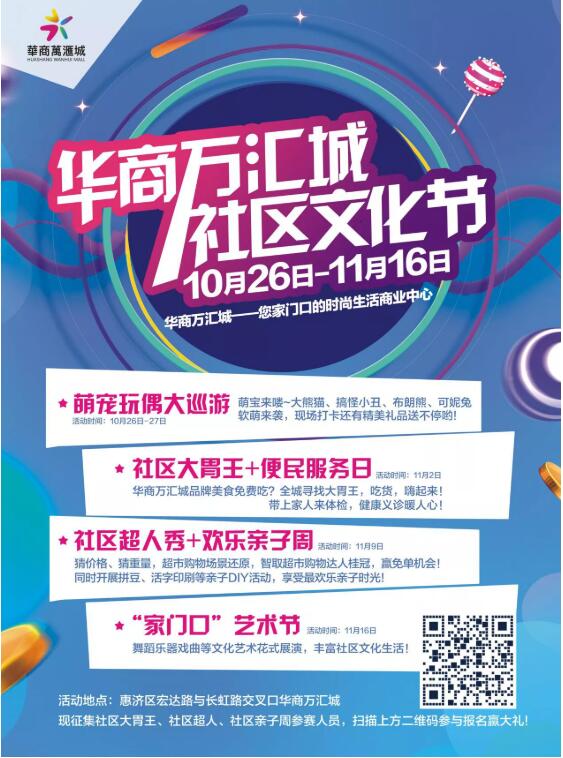 10月26日-11月16日,华商万汇城社区文化节系列主题活动即将火爆来袭,“新店聚汇”、“萌宠玩偶大巡游”、“社区大胃王+便民服务日”、“社区超人秀+欢乐亲子周”、“家门口艺术节”五大主题活动即将掀起邻里互动热潮,带你感受家门口的时尚生活商业中心——华商万汇城的品牌魅力。