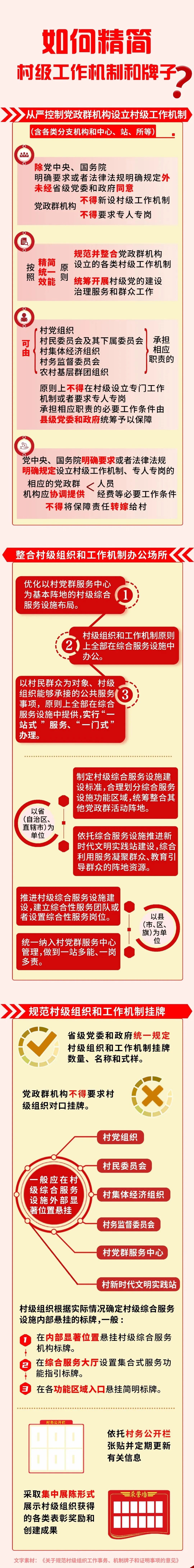同时,赴16个市201个村(社区)调查摸底,在全省开展村(社区)工作事务、机制牌子、证明事项专项整治,推动把“上墙的形式主义”拿下来。“按照上级统一部署,我们摘掉多挂的牌子,墙上干净整洁多了,不必要的工作少了,为群众办实事的精力多了。”一名村干部说。
