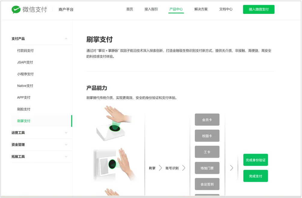 此外,微信刷掌官方网页也已经上线,针对产品能力、设备介绍以及接入方式等均有说明,通过「微信支付商户平台-产品中心-刷掌支付」即可查看。