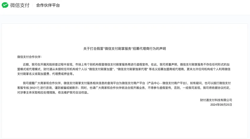 声明显示,微信支付刷掌服务不存在任何形式的加盟模式或代理模式,财付通从未授权任何机构或个人以“微信支付刷掌加盟”、“微信支付刷掌独家代理”等名义招募加盟商或代理商,更未允许任何机构或个人利用微信支付刷掌名义收取加盟费、代理费或押金等。