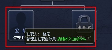 (3)暂未开启:每一个职位都根据不同的商会等级来限制开放,没有达到相应的商会等级,没有开放的职位,职位状态为暂未开启,鼠标放到上面有加成效果与开启条件。