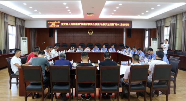 活动首先参观了县检察院受理案件大厅、未检办案中心、院史陈列室等,检务工作人员作了具体情况介绍。随后,在县检察院会议室召开了“检察护航民企发展”工作“两长”座谈会,围绕如何充分发挥检察职能依法保护民企合法权益开展讨论交流。会上,县检察院党组副书记、专职检委会委员邓太华简要介绍了检察机关的职能职责和上半年工作概况,县检察院党组成员、副检察长郑光杰汇报了2018年以来检察机关开展