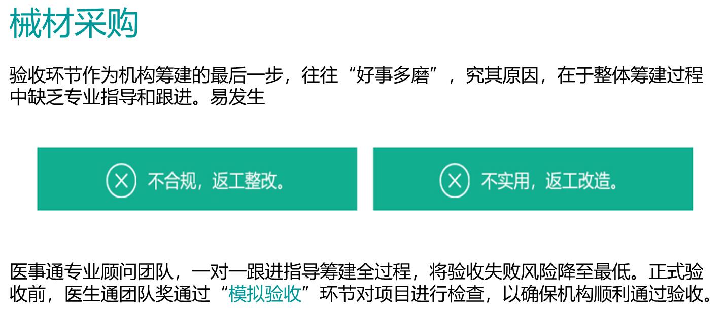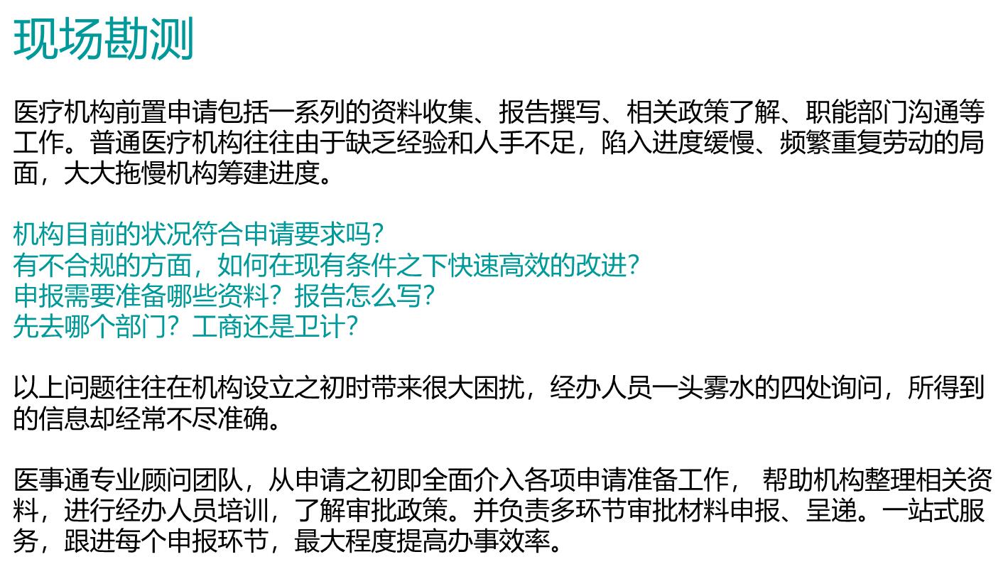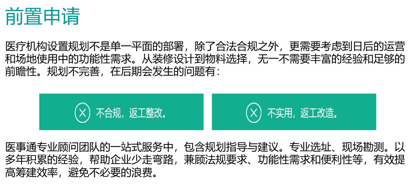 场地确认 工商注册 医疗前置申请 设置医疗许可 提报验收 注册医师 医生资质 平面图 验收前自查 辅助整改 消防备案 环评备案 装修监理 工程规划