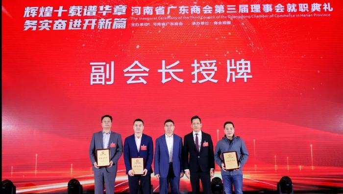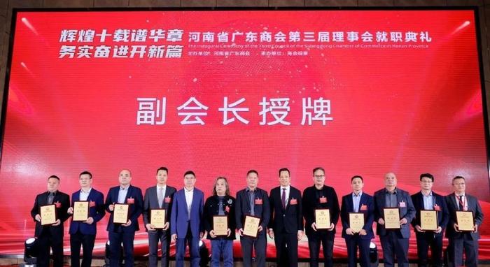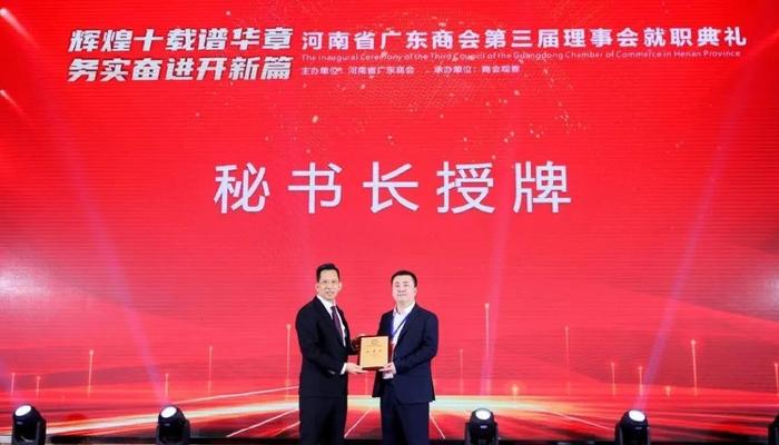 河南省广东商会会长伍坚浓为荣誉秘书长杨瑜聪、丁国宇颁发牌匾