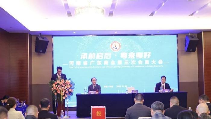 当日下午, 河南省广东商会第三次会员大会在庄严的国歌中拉开帷幕,河南省工商联组织部曾研宣读了《关于同意河南省广东商会换届选举的批复》文件。
