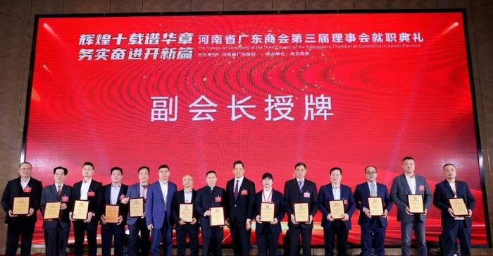 广东省商务厅交流处一级调研员李利致辞 会上,与会主要领导为河南省广东商会第三届理事会会长、常务副会长、副会长、副会长单位及秘书长、监事进行了授牌。对终身荣誉会长、荣誉秘书长颁发了证书。