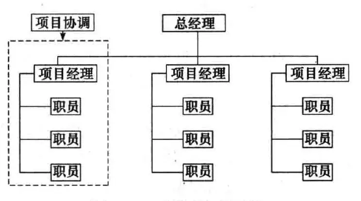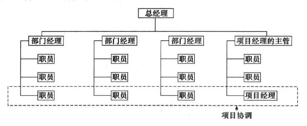 采用这种组织结构时,项目是以部门为主体来承担项目的,一个项目由一个或者多个部门承担,一个部门也可能承担多个项目,有部门经理也有项目经理,所以项目成员有两个负责人。