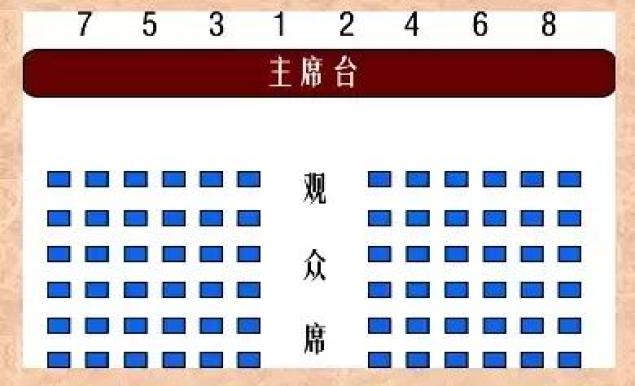 主席台座次排列,领导为单数时,主要领导居中,2号领导在1号领导左手位置,3号领导在1号领导右手位置;可参见下图的座次排列图:
