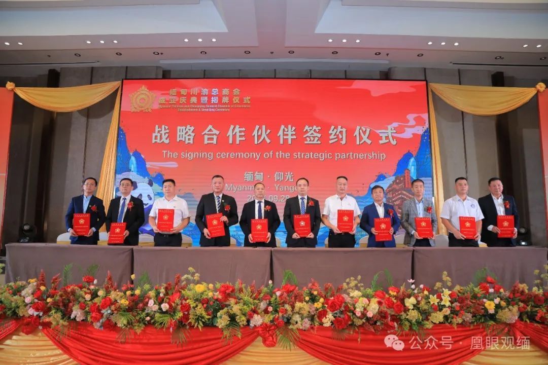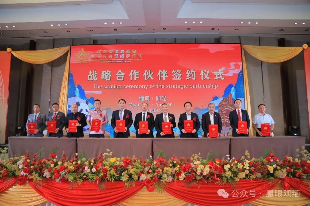 庆典上还举行了隆重的签约仪式。缅甸川渝总商会与海内外30余家商协会、组织、机构签署了“战略合作伙伴协议”。这些协议的签署不仅标志着双方合作的进一步深化和拓展,更为缅甸川渝总商会未来的发展注入了新的动力和活力。随着双方代表郑重签字,战略合作伙伴关系正式确立,签约仪式圆满礼成。全场嘉宾再次以热烈的掌声庆祝未来光明前景的到来。