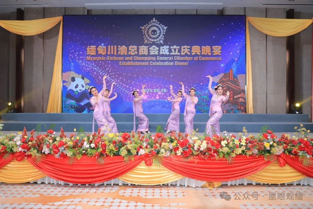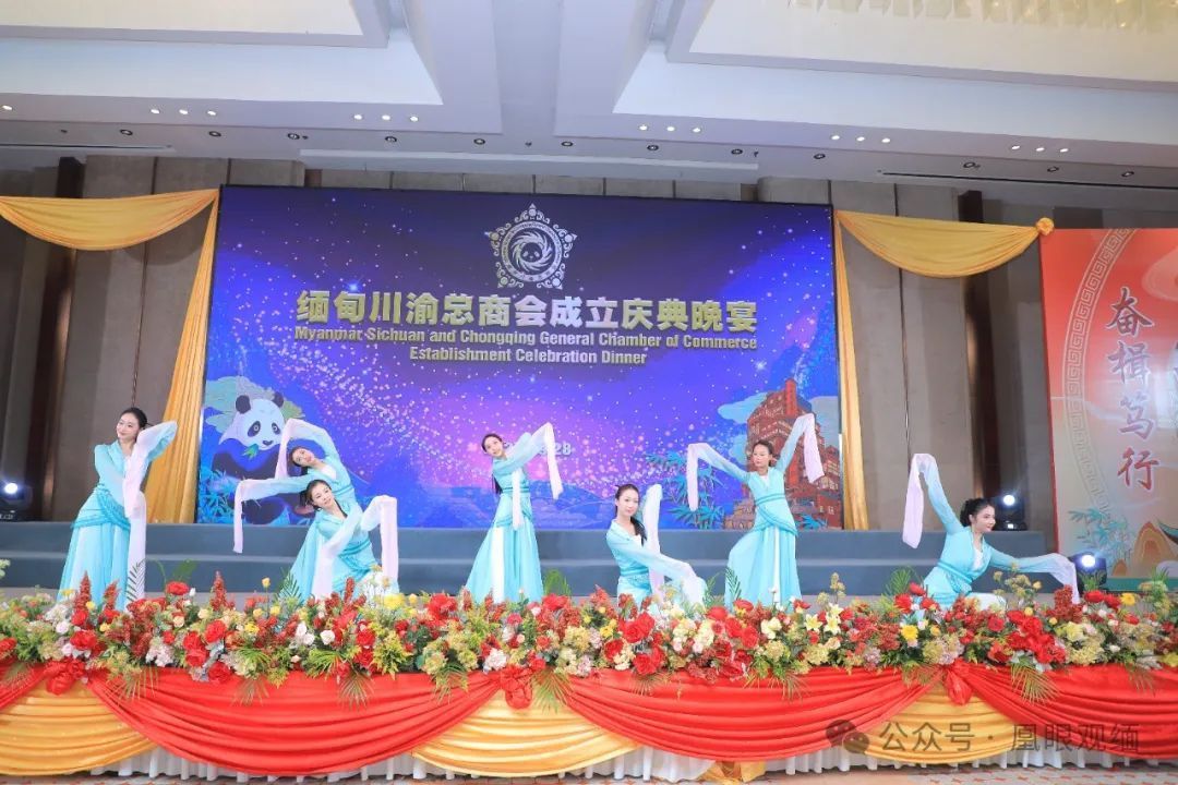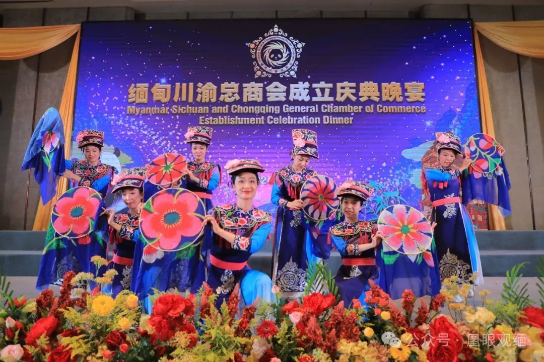 庆典晚宴在星光与灯火的交相辉映下拉开了帷幕。精美的佳肴、热烈的气氛,精彩的节目……中方表演团队战旗飞舞歌舞艺术团(成都)有限责任公司、四川省江油市文化馆的艺术家与缅甸的舞蹈艺术家们的共同联袂上演了一场震撼人心的文艺表演,让在场的每一位嘉宾都感受到了缅甸川渝总商会的热情与好客。大家举杯共祝缅甸川渝总商会的美好未来,共同期待中缅两国经贸合作的新篇章。