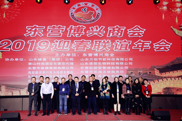 1月12日,东营博兴商会2019迎春联谊年会在万达嘉华酒店举行,东营市政协副主席、市工商联主席生钦勇,东营市工商联党组成员、副主席刘剑辉,博兴县政府副县长李双明,东营区委常委、统战部长杜书亮,东营区政府党组成员刘辰勇,博兴县政协副主席、县工商联主席安长东,东营区政协副主席马献忠,东营区委统战部副部长、区工商联党组书记、主席张龙潭,东营博兴商会会长曹新禄与商会各会员企业,在东营工作、生活的部分博兴籍老领导以及各兄弟商会代表,东营博兴两地的部分企业家200余人共同参加活动。