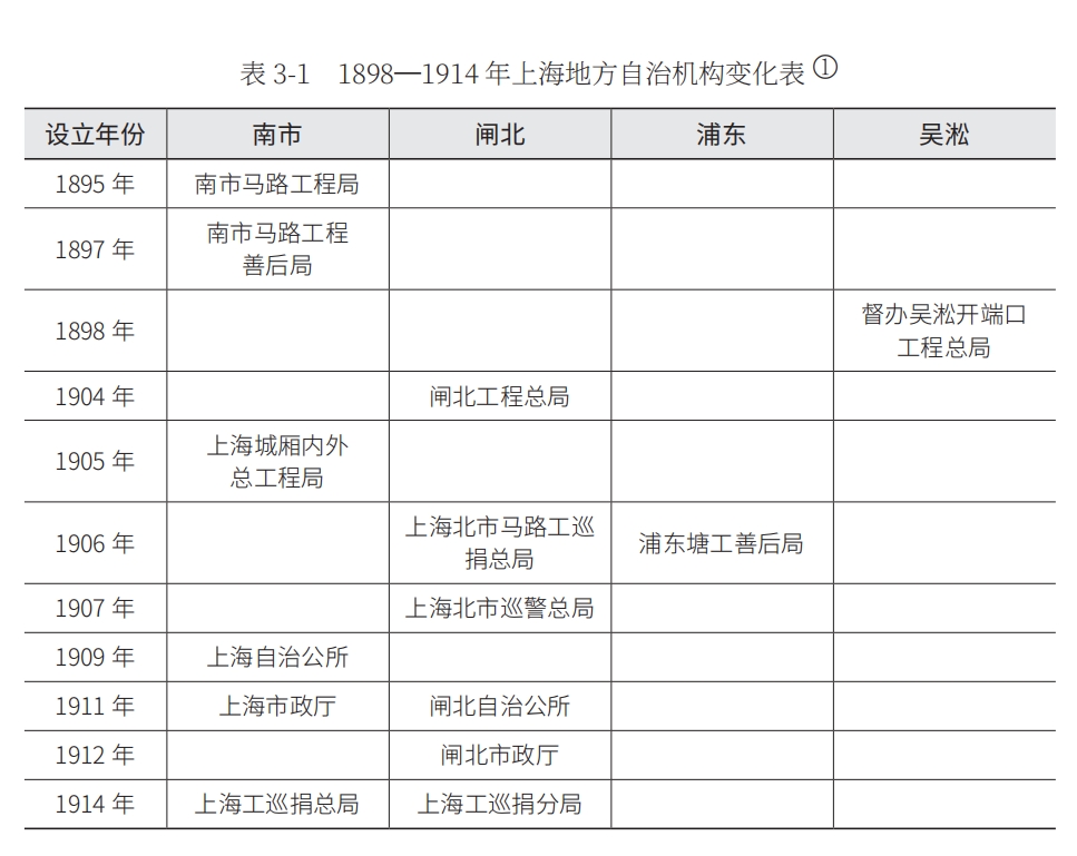 晚清上海外国租界的市政机关分为公共租界工部局与法租界公董局,华界的市政机关也并不统一,处于分治时代。除了上海县城有自己的市政机关外,闸北地方,逼近租界,初由地方绅商筹款建筑桥路,嗣以商力不济,呈请官办。1904年,两江总督周馥派道员徐乃斌设立“闸北工程总局”,后改名为“闸北工巡总局”。黄浦江入海口的吴淞地区开埠更早,1898年就有两江总督刘坤一奏准开办“督办吴淞开端口工程总局”。另外,1906年,在一江之隔的浦东地区,上海知县王懋琨批准高行、陆行两乡绅商申请,设立“浦东塘工善后局”,名义上像是水利工程机关,实际上的设置系属市政范围。详情参见下表: