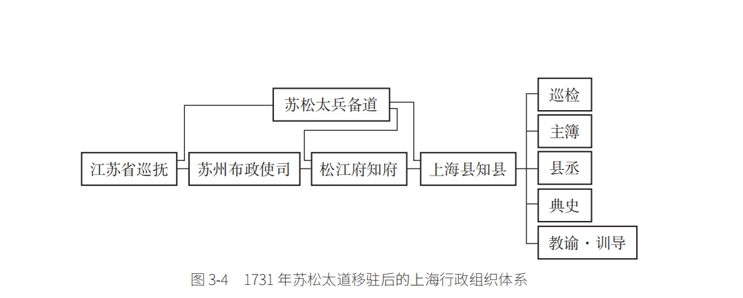 与其他县城稍有不同的是,1731年(清雍正九年),上海县城又成为分巡苏松太兵备道(简称“苏松太道”)的治所,行政组织稍有改变。如下图: