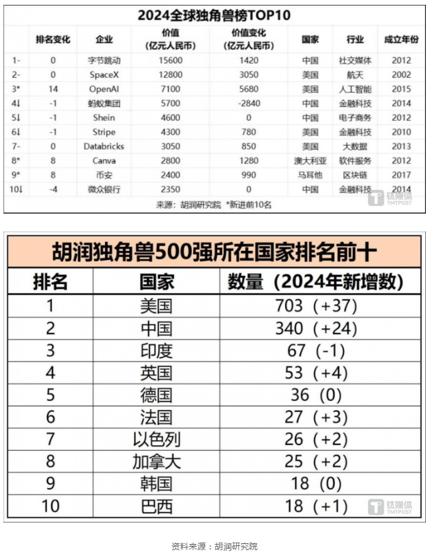 胡润研究院最新发布的2024年全球独角兽企业数统计显示,前十名几乎被中美两国垄断,各有4名,欧洲无一上榜。
