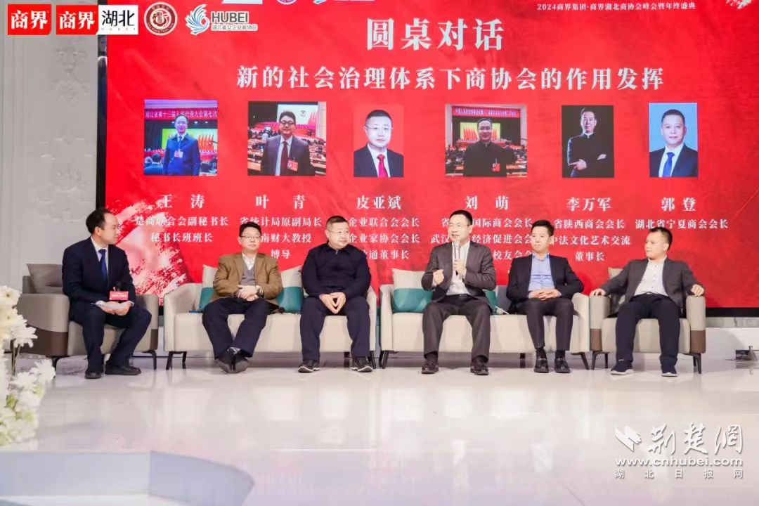 会上,举行了圆桌对话,对话由王涛主持。围绕新的社会治理体系下商协会的作用发挥开展第一轮对话。中南财经政法大学教授、博士生导师叶青,湖北省企业联合会、湖北省企业家协会会长、武汉长盈通光电技术股份有限公司董事长皮亚斌,湖北省长江国际商会会长、武汉校友经济促进会会长、湖北省北京大学校友会会长、长江国际控股集团董事长刘萌,湖北省陕西商会会长、中法文化艺术交流(武汉)有限公司董事长李万军,湖北省宁夏商会会长郭登进行了探讨。围绕新形势下商协会秘书长的角色定位开展第二轮对话。湖北省青创会会长熊伟、湖北省银行业协会副秘书长周永先、湖北省汽车售后服务行业协会会长张岩、武汉市老字号协会秘书长章骏、武汉市十堰商会秘书长陈国云进行了经验分享。