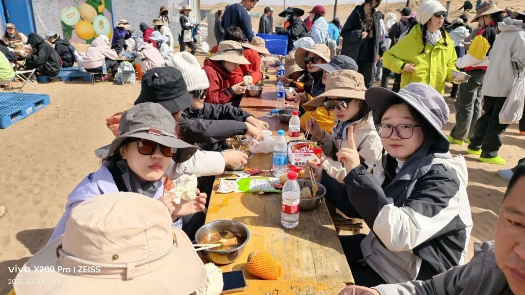 巾帼志愿者们化身“后勤”娘子军,肩扛手提穿梭于营地。商会会员胡津梅带头搬运物资,鬓角已渗出汗珠。“这些课桌椅是从学校协调购买的,虽是旧物,但环保又实用!”她们依地势将百余套桌椅摆放成临时就餐区。临近中午,从沙漠深处种树归来的志愿者们陆续在此落脚,脸上漾满了笑意。