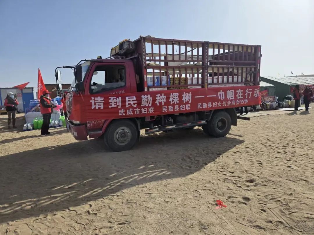 烈日当空,民勤县收成镇沙丘连绵处,数百名志愿者正挥锹培土,新栽的梭梭苗在春风中舒展嫩枝。不远处,两辆满载物资的货车驶入营地,鲜艳的“巾帼志愿者”红马甲在黄沙中格外醒目......