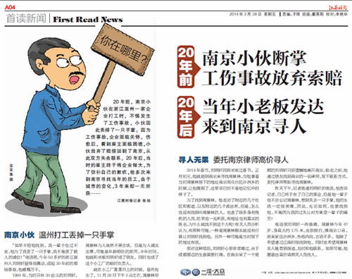 温州网讯 “周景林,你在哪?”这是江南时报3月28日发在头版头条的独家新闻,该报道称20年前,刘明轩在温州老家开办小型炼钢厂,当时在该厂打工的南京沙洲七大队小伙周景林不幸发生工伤事故,断了右手掌。伤愈后,看到雇主面临工厂关停困境,周景林放弃10万元索赔回南京,从此双方失去联系。近年来,辗转到成都做生意的刘明轩事业有成,多次到南京寻找周景林,但怎么也找不到。