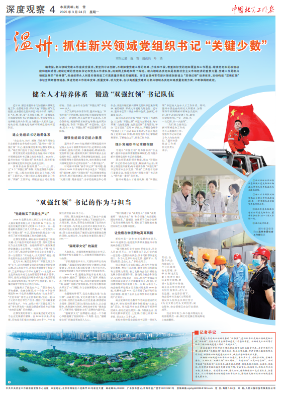编者按:新兴领域党建工作座谈会提出,要坚持守正创新,不断探索党建工作的思路、方法和手段,着重抓好党的组织覆盖和工作覆盖,增强党组织的政治功能和组织功能,建设过硬的党组织书记和党务工作者队伍,巩固网上阵地和网下阵地。新兴领域各类组织是发展社会主义市场经济的重要力量,党建工作是新兴领域发展的“助推器”,党组织带头人则是引领党建工作高质量开展的关键因素。浙江省温州市在新兴领域创新建立“双强红领”培养体系,加快构建“双强红领”书记全周期管理链条,推进党建工作效率变革、质量变革、动力变革,在以高质量党建助力新兴领域各类组织高质量发展方面,不断取得新成效。
