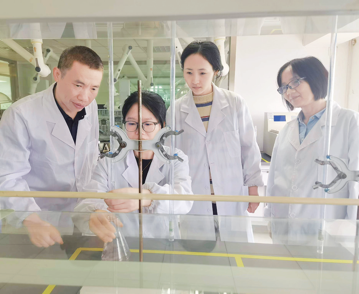 浙江禾本科技股份有限公司党支部书记廖文斌(左一)带领团队在实验室开展研究工作。