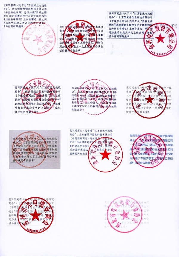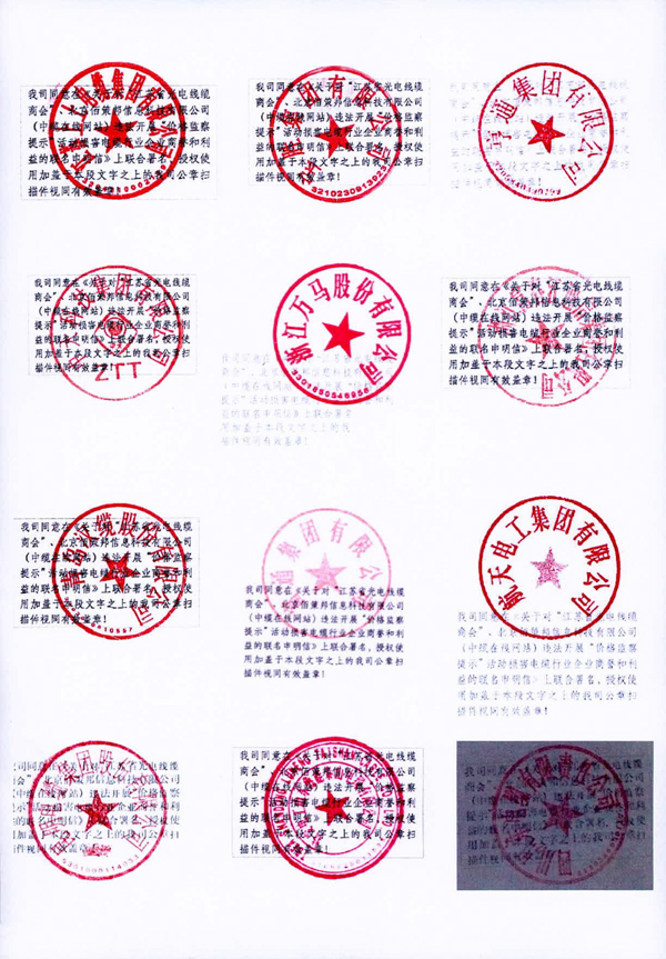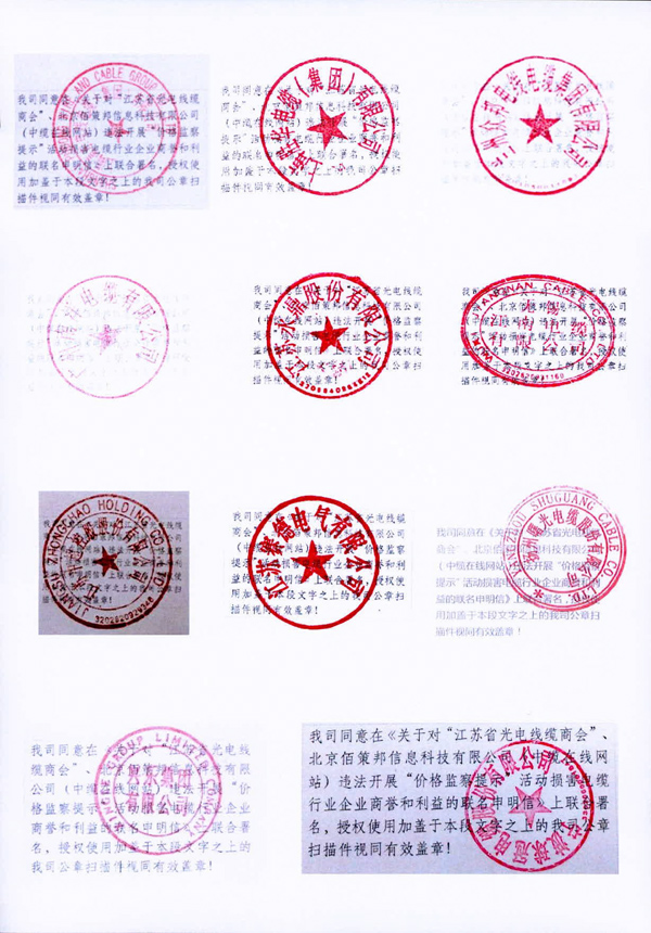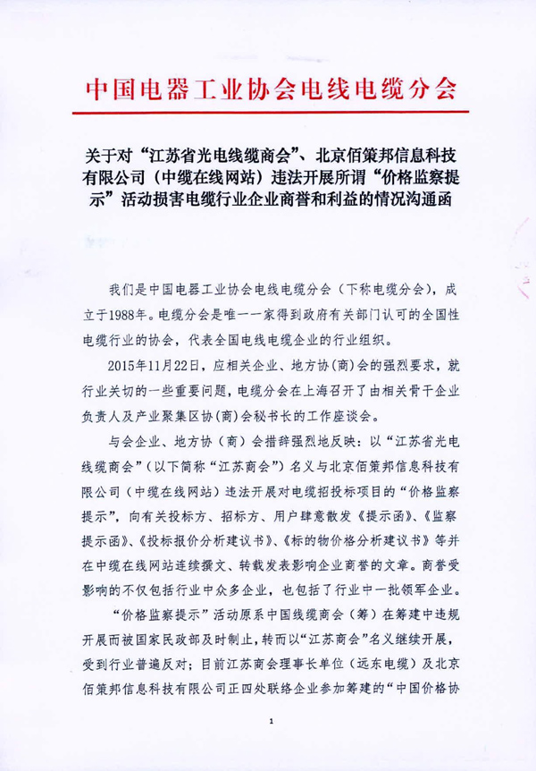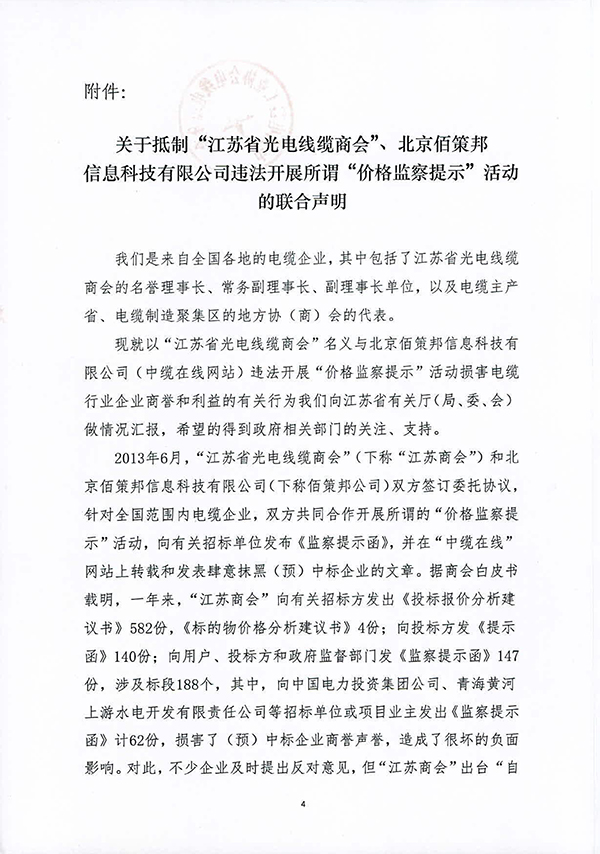 澎湃新闻记者获悉,这份在行业内引起巨大震动的“声明”,其全名为《关于抵制“江苏省光电线缆商会”、“北京佰策邦信息科技有限公司”违法开展所谓“价格监察提示”活动的联合声明》。