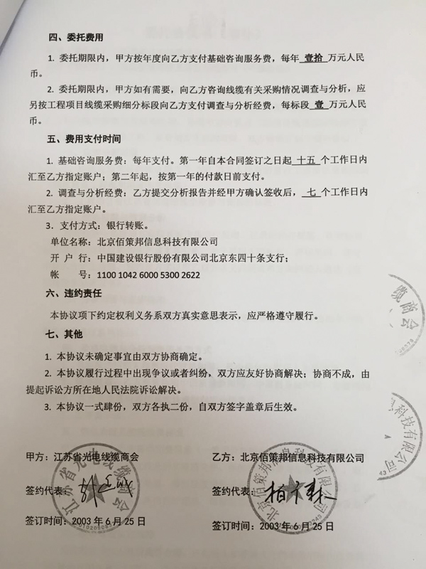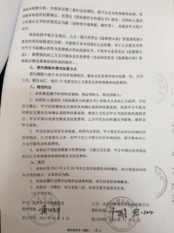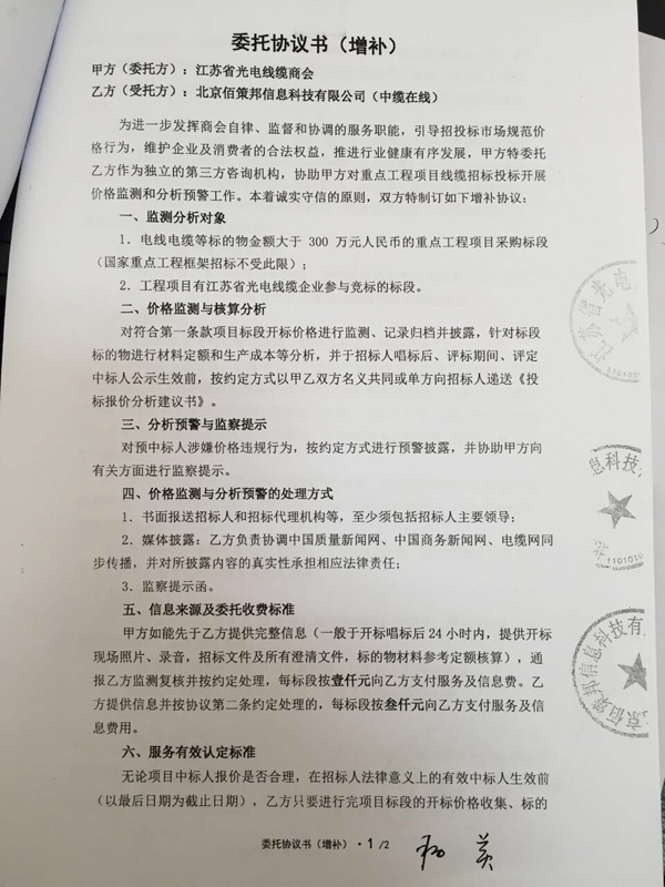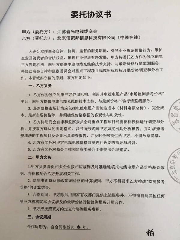 在江苏电缆商会和佰策邦信息科技有限公司(中缆在线)签订的委托书上,澎湃新闻记者看到,按照约定,江苏电缆商会每年需向“中缆在线”支付十万元的基础咨询服务费,同时,每调查分析一个标段,支付一万元服务费。对于委托费,黄解平对澎湃新闻表示,由于会费不够,很多会员单位又没有出来分摊,“所以远东的确垫付了不少,而他们作为理事长单位分摊一些也是应该的”。
