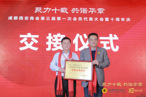 陕西商会西南地区联盟第一届轮值主席李靖为陕西商会西南地区联盟第二届轮值主席李孝文授牌并进行交接仪式。
